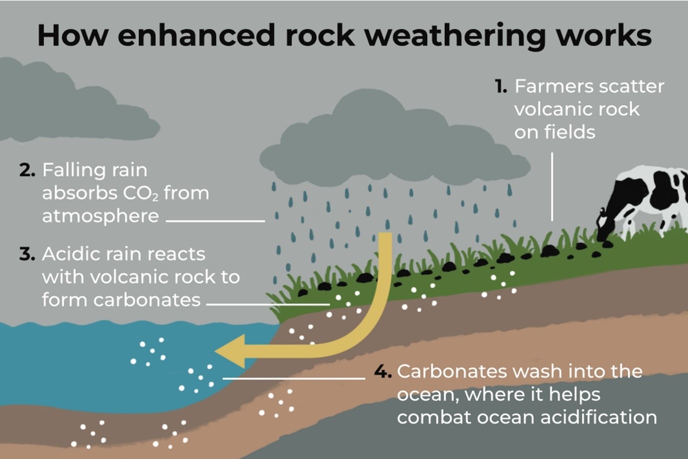 Figure 1. Enhanced rock weathering improves soil health, sequesters carbon, and combats ocean acidification. Credit: AGU Advancing Earth and Space Sciences.