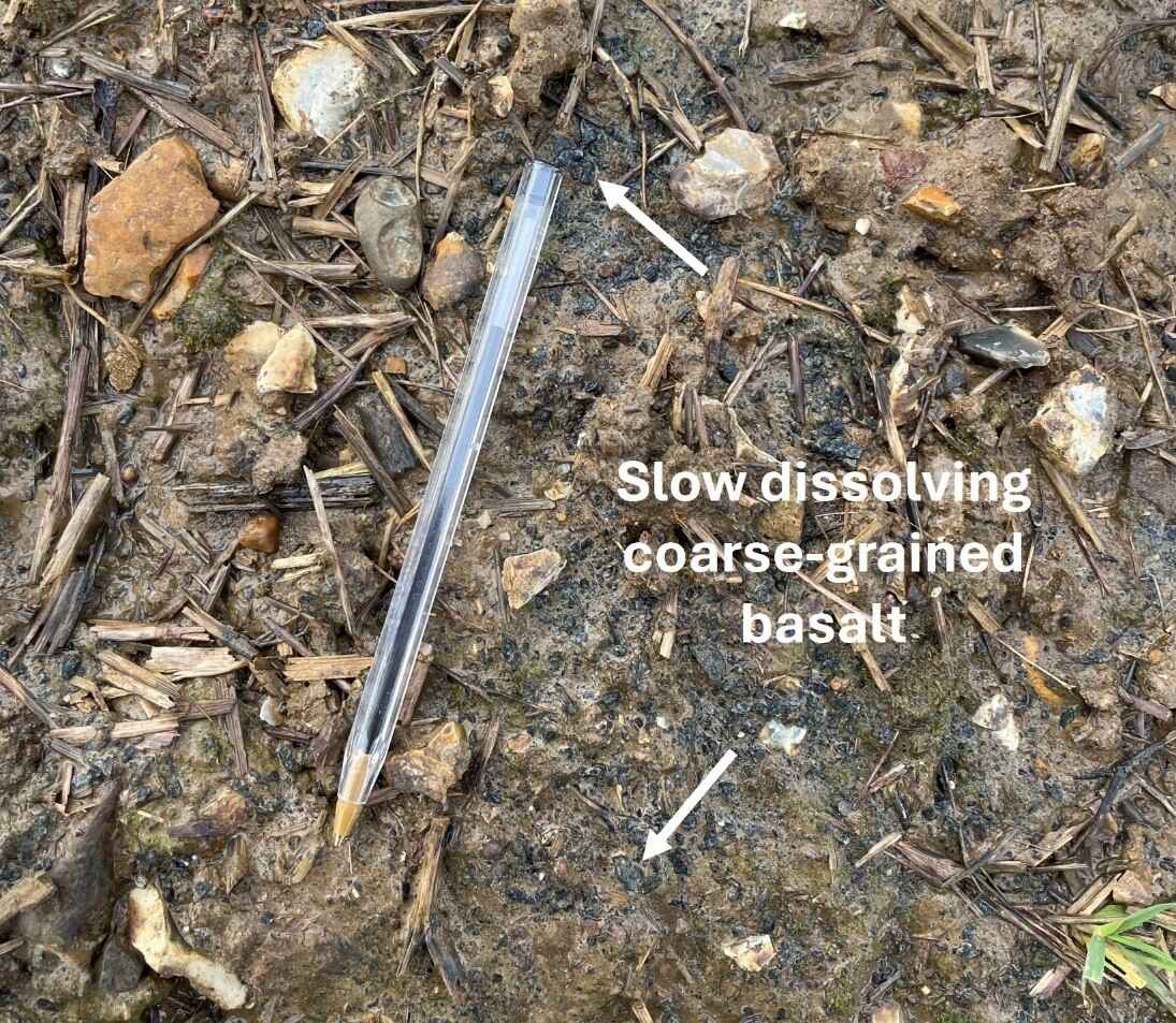 Figure 2. Enhanced rock weathering trial by spreading basalt on arable land at Rothamsted Research Harpenden, UK. Fine-grained basalt has been dissolved, whereas coarse-grained basalt is still visible on the soil, six months after spreading. Image ©Evangelos Mouchos.
